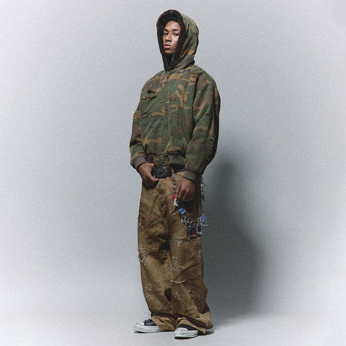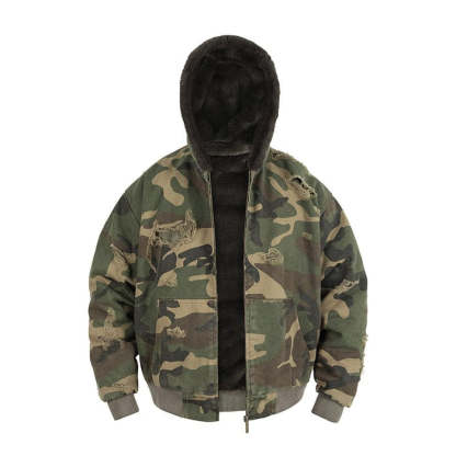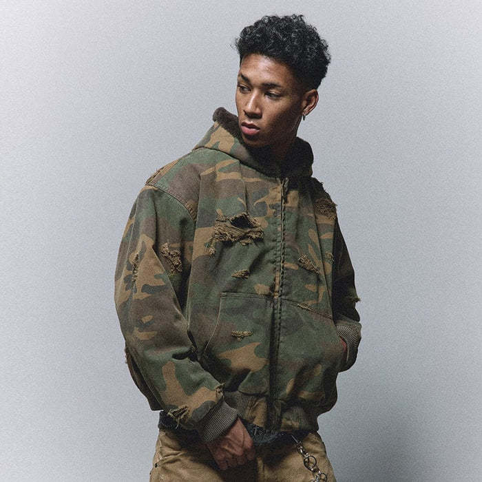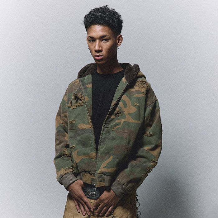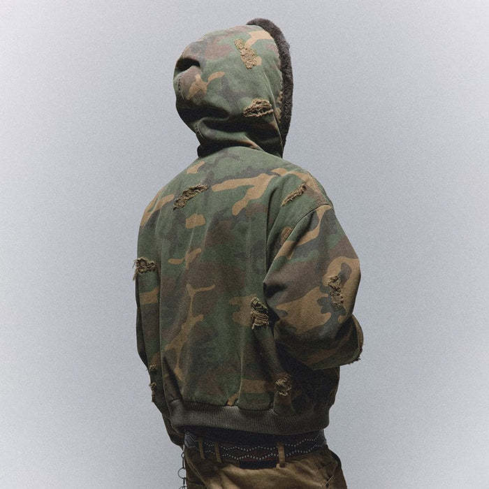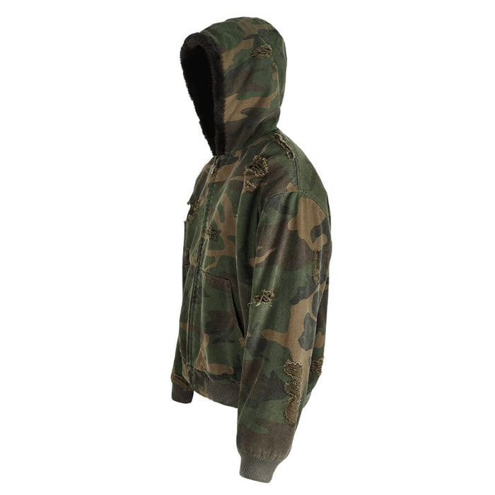 CAMO DISTRESSED PLUSH-LINED HOODIE JACKET