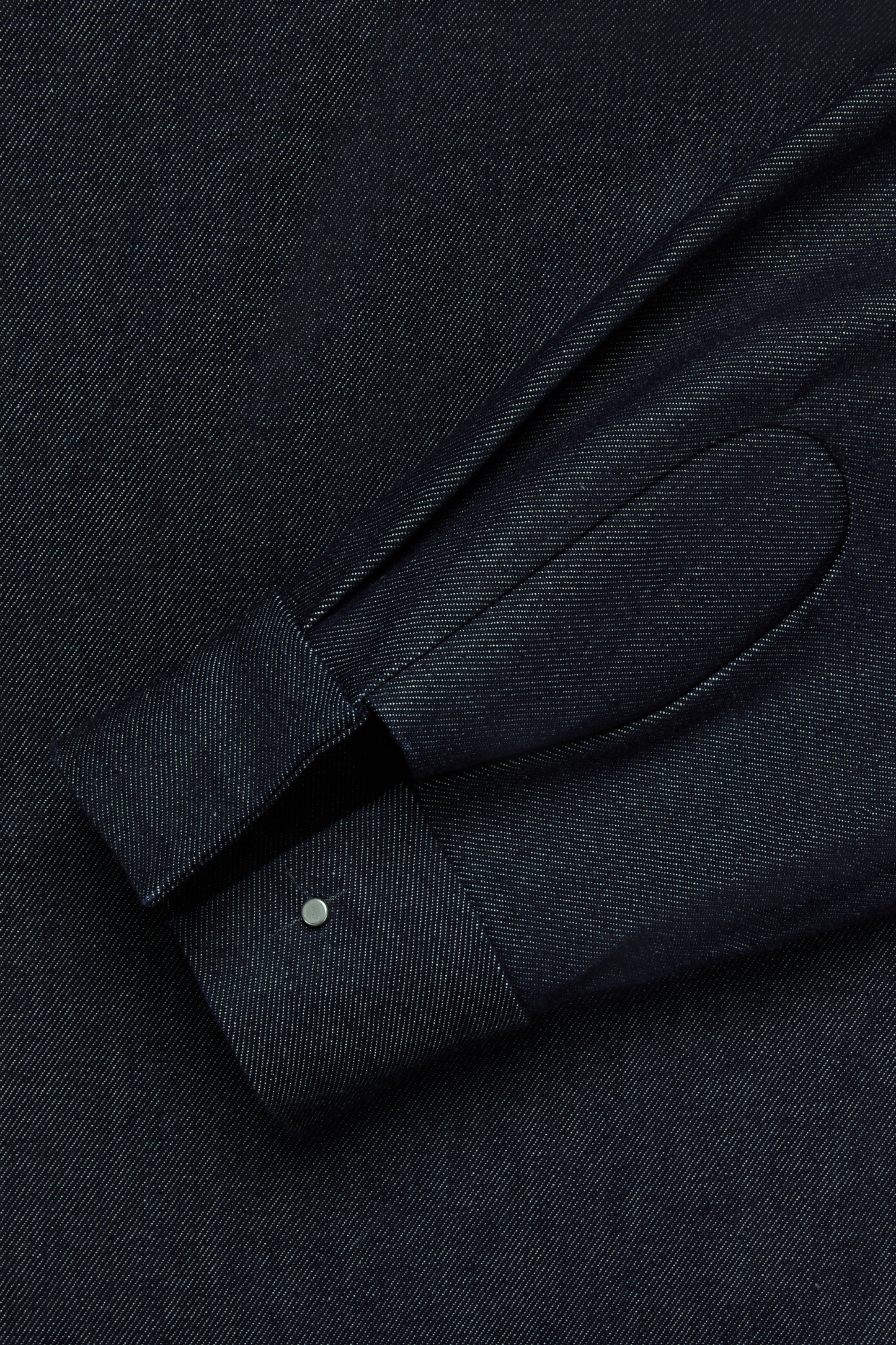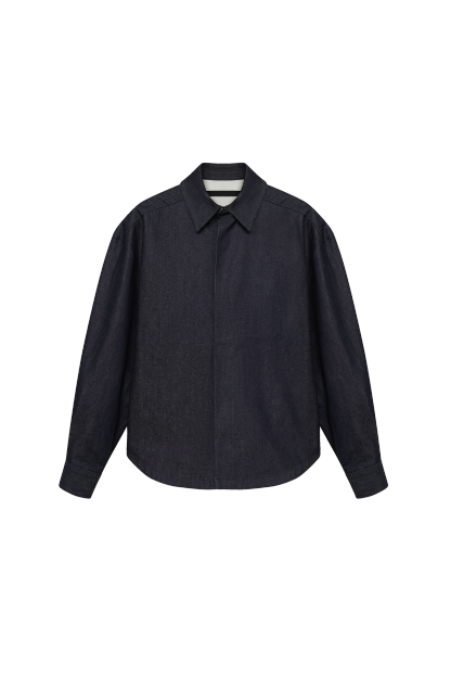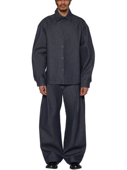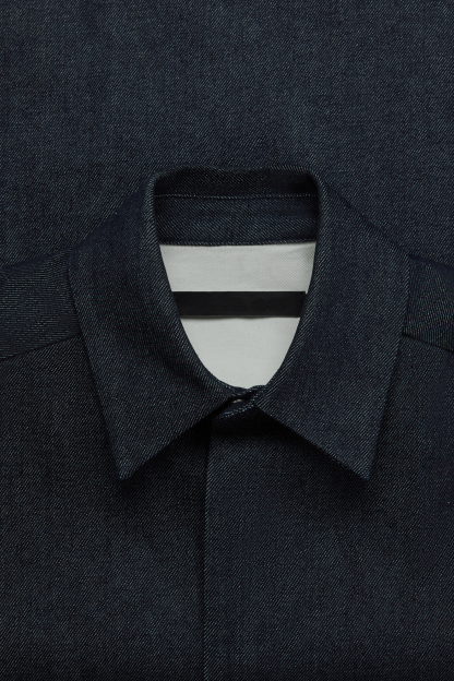 The Denim 440 Jacket is made from a Turkish cotton twill denim. The garment features YKK hardware with poppers as closures and several pleats providing shape to the garment. The shirt also has two hidden seamless pockets and the Seventh signature arch detail at the sleeve. This material is sourced and produced in South Korea.?