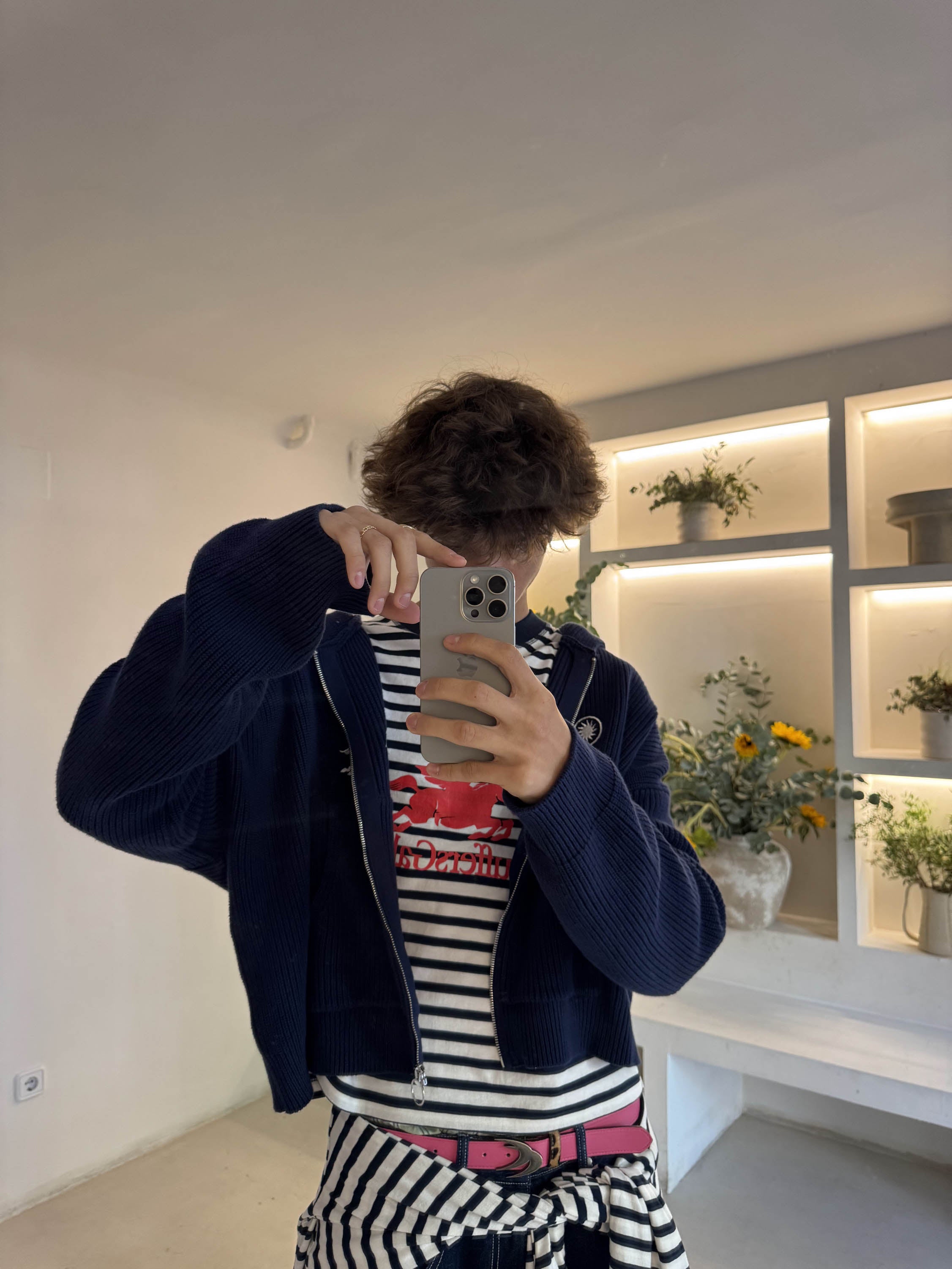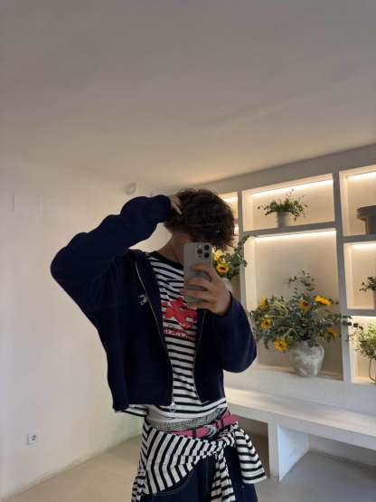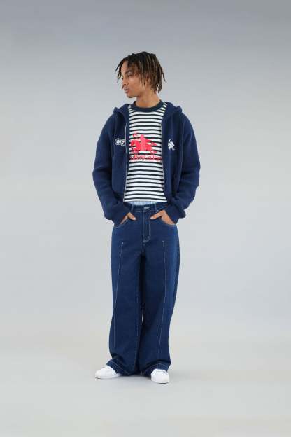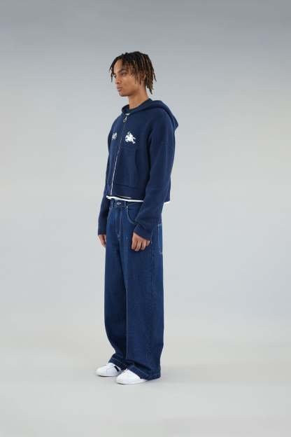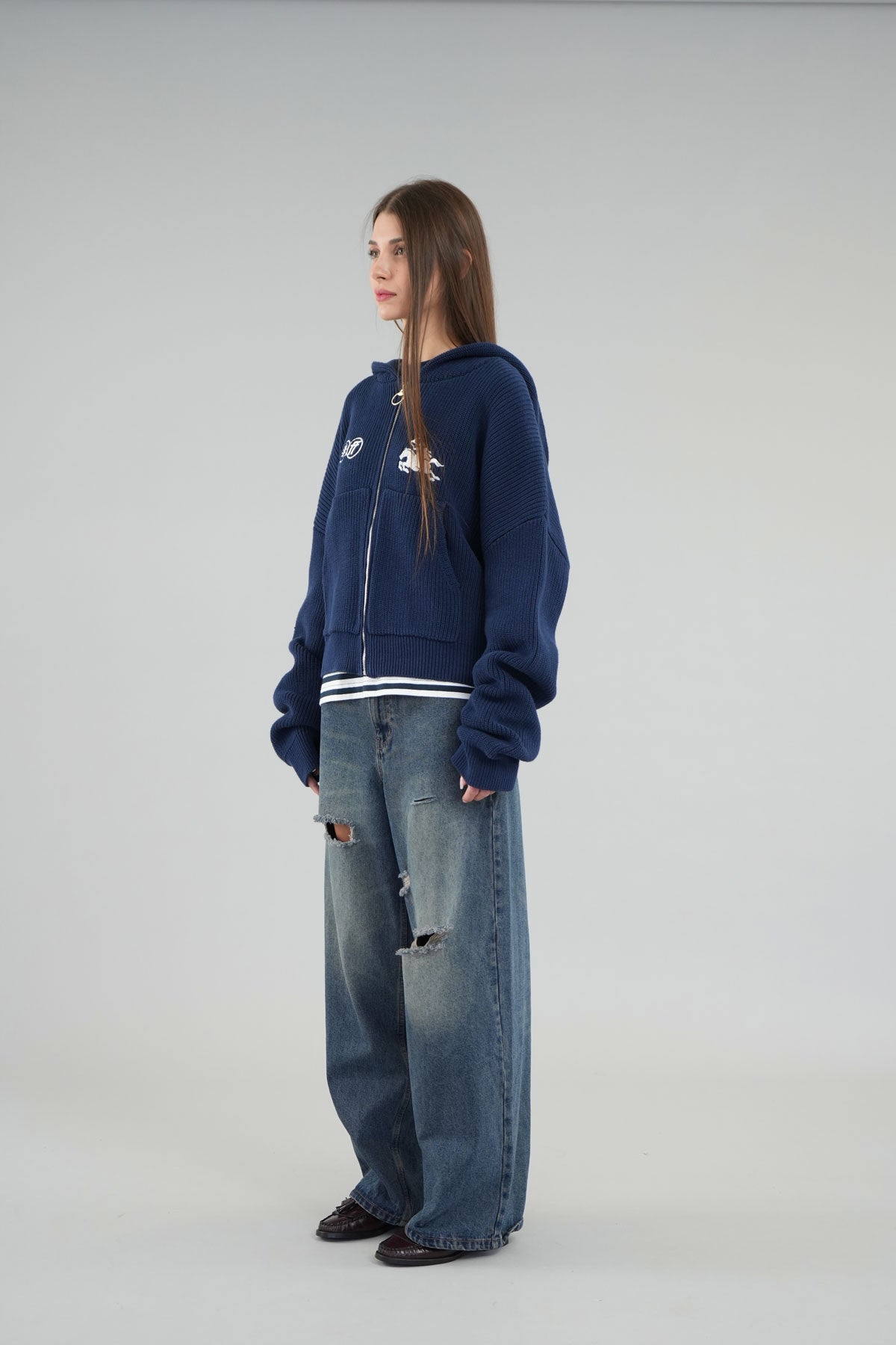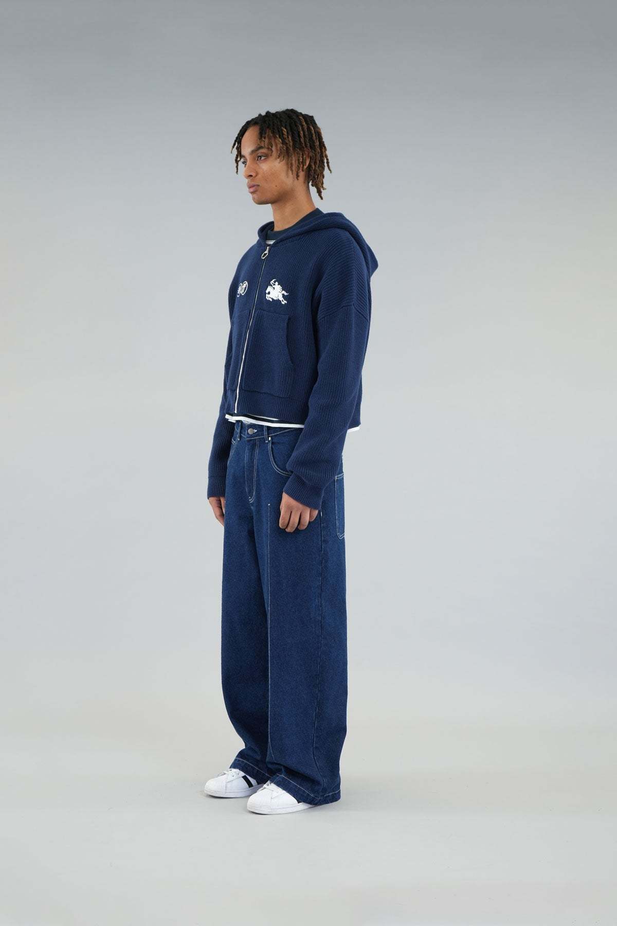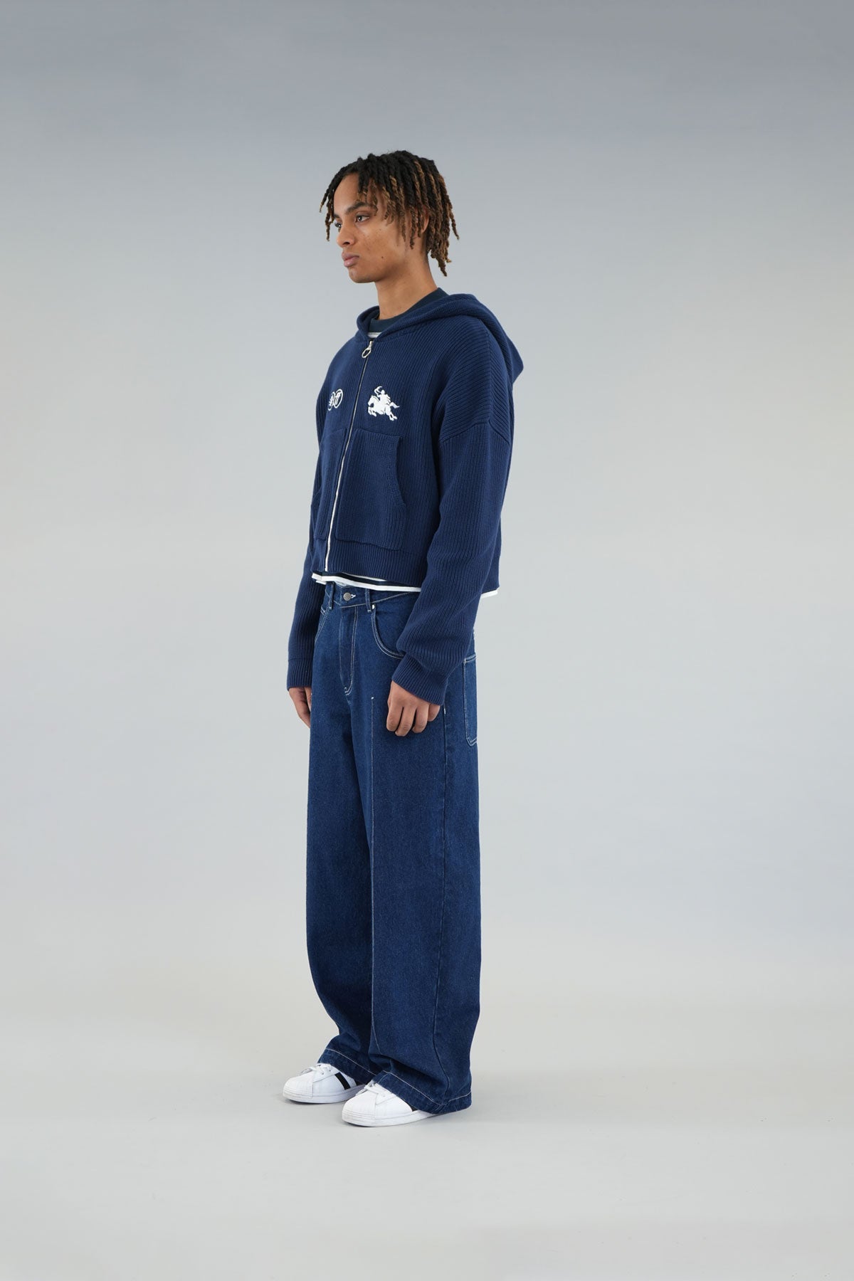 Navy knit hoodie with a front zipper and hood. It features a white embroidered Scuffers rider logo on the chest, along with two additional graphic emblems. The back displays the Scuffers logo embroidered just below the hood. This knit sweater includes kangaroo pockets and a zipper closure with a metal ring pull.
