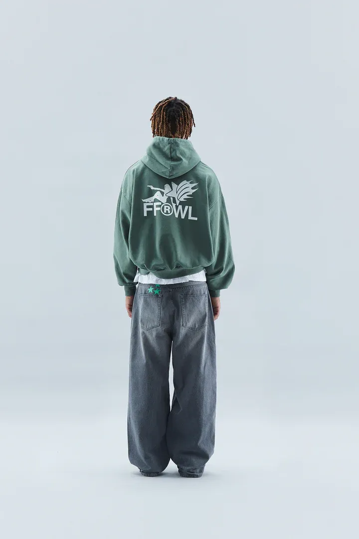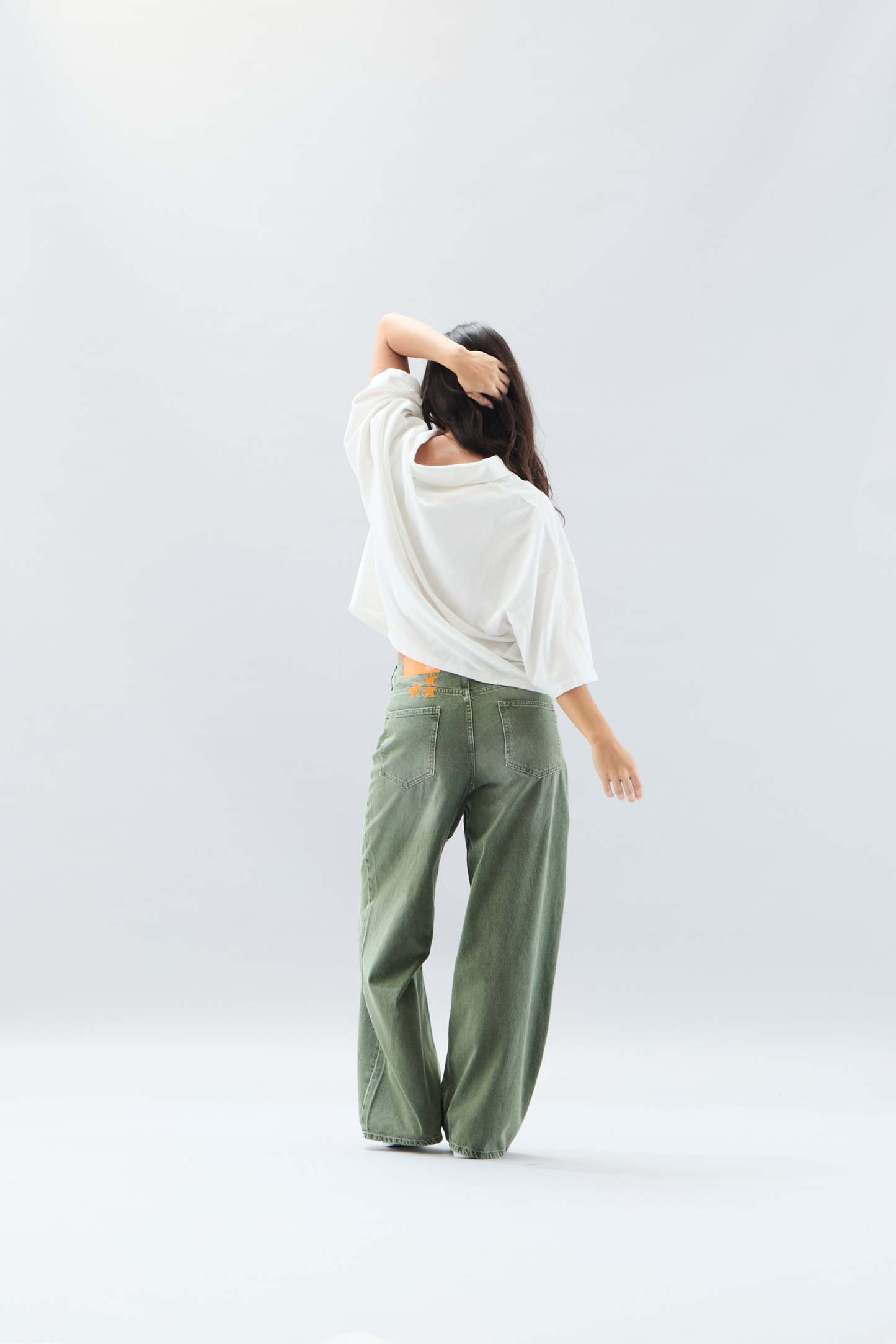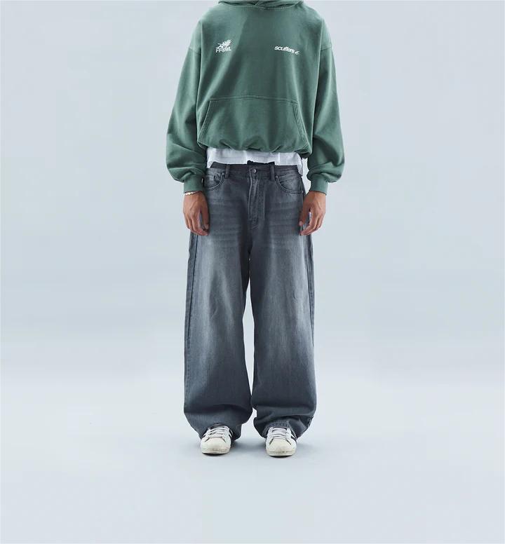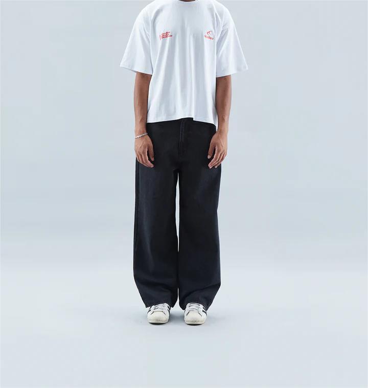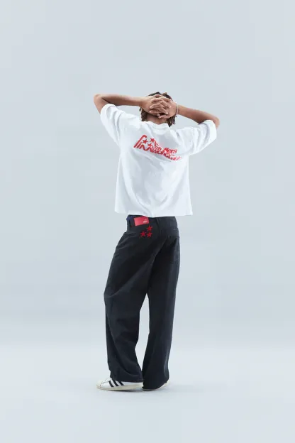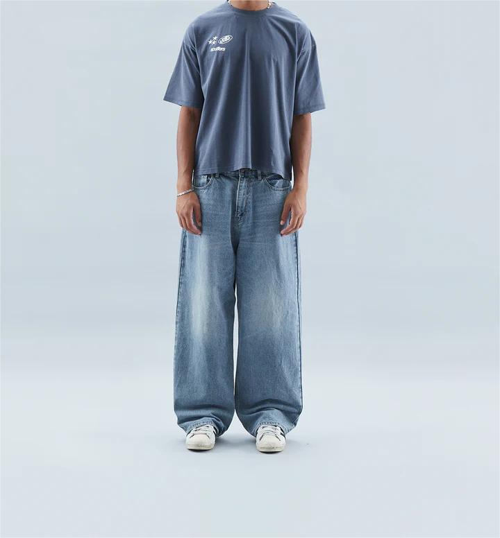 Oversized baggy style denim jeans, with standard waistband and a distressed effect. Five-pocket traditional jeans with our 'Worldwide' stars stitched on the upper left back.?