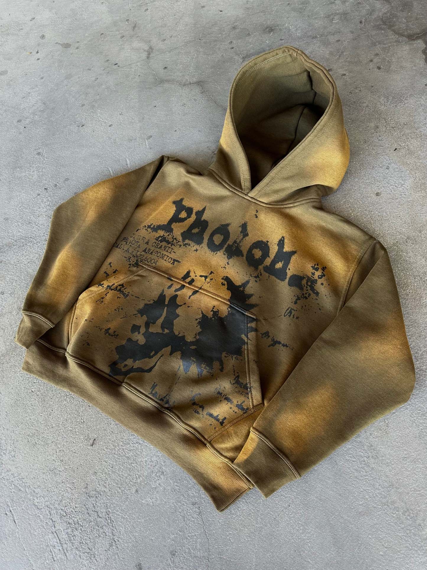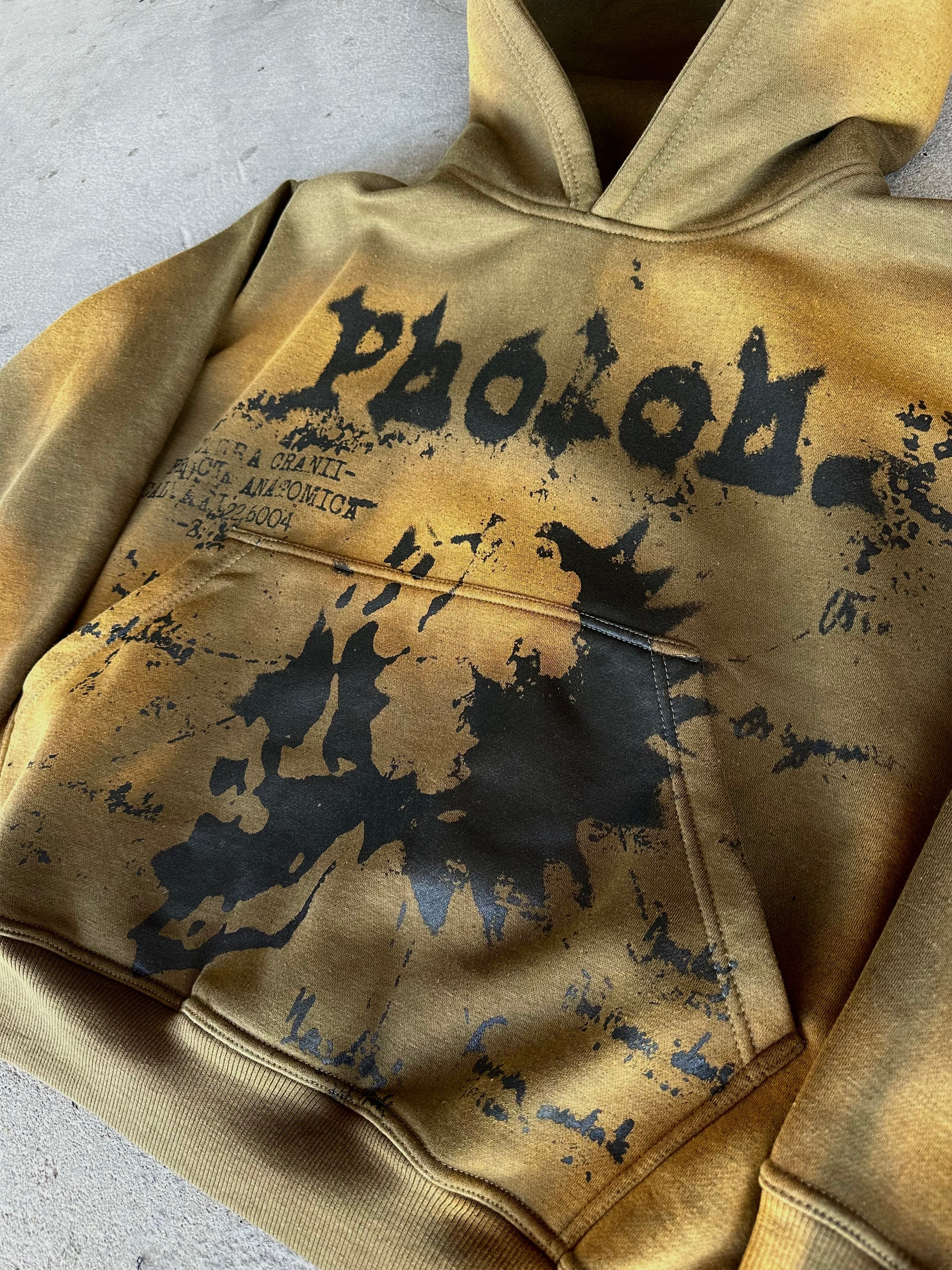 These garments are made out of 400 GSM Cotton in a Washed Olive. We used a bleach type of wash to show all the different spots marked throughout the hoodie. This hoodie comes with an Oversized Pocket and Hood. On the front, there is a black water-based screen print to have that 'no feel' touch. Each piece comes with there own woven label and fits true to size. Priced at $50