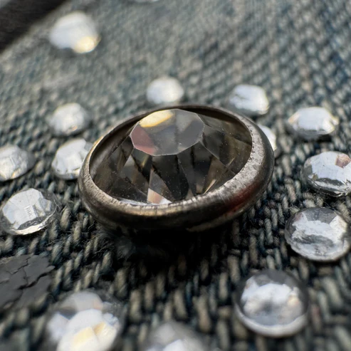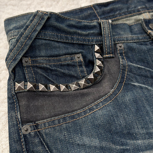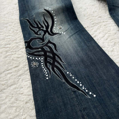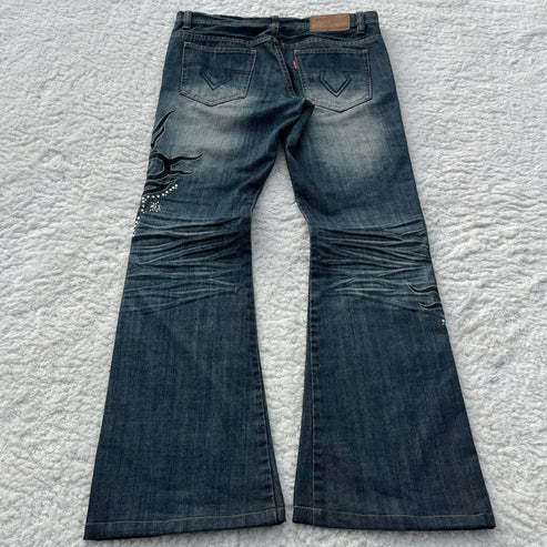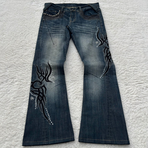 flared jeans showcase two intricate tribal embroideries, adorned with sparkling Swarovski crystals and rhinestones. The right front pocket with pyramid studs adds an extra touch?of character to these beauties.?