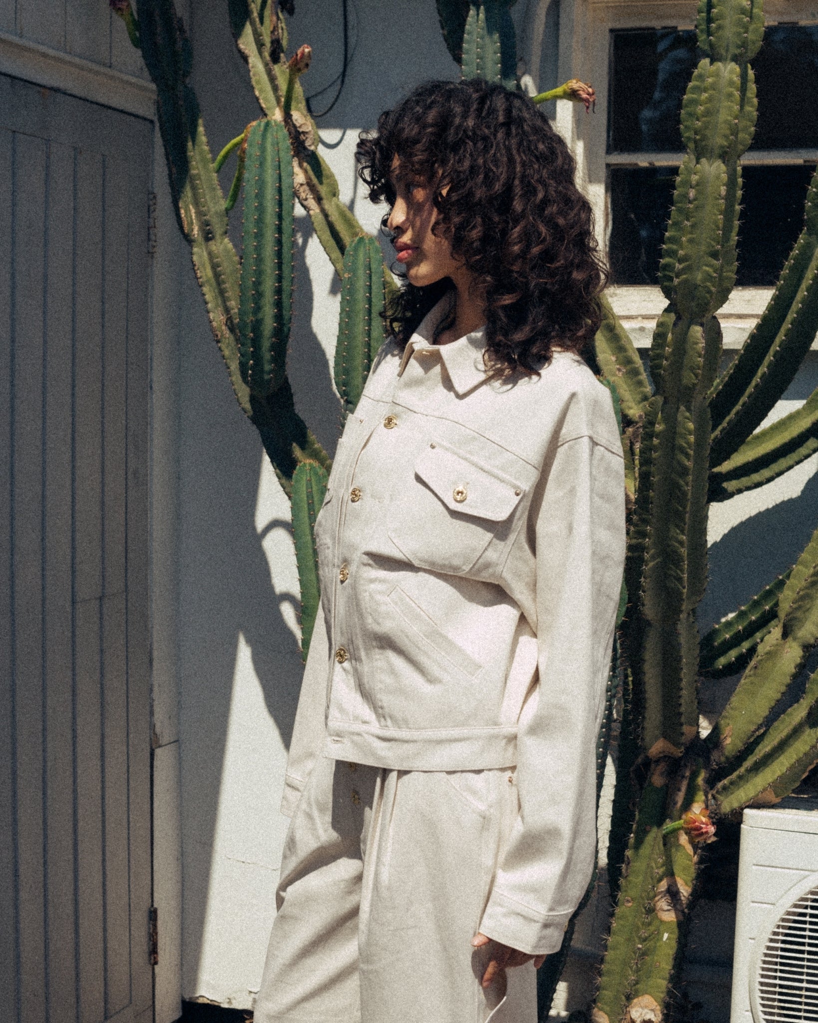 The pants are buggy pants that hold the trend, and the relaxed and wide silhouette offers leg length effects and comfortable comfort. On the other hand, the jacket is a short design and has a balance that makes the upper body look compact. This combination creates an exquisite contrast up and down, giving a stylish impression.