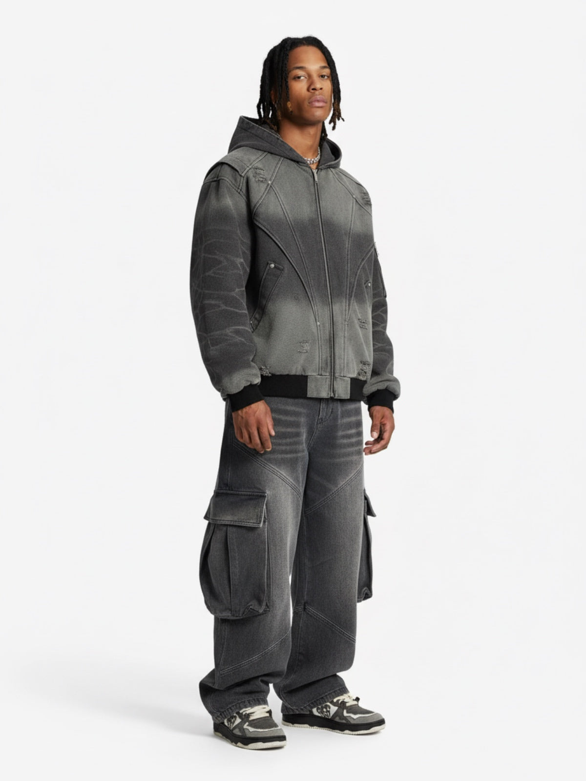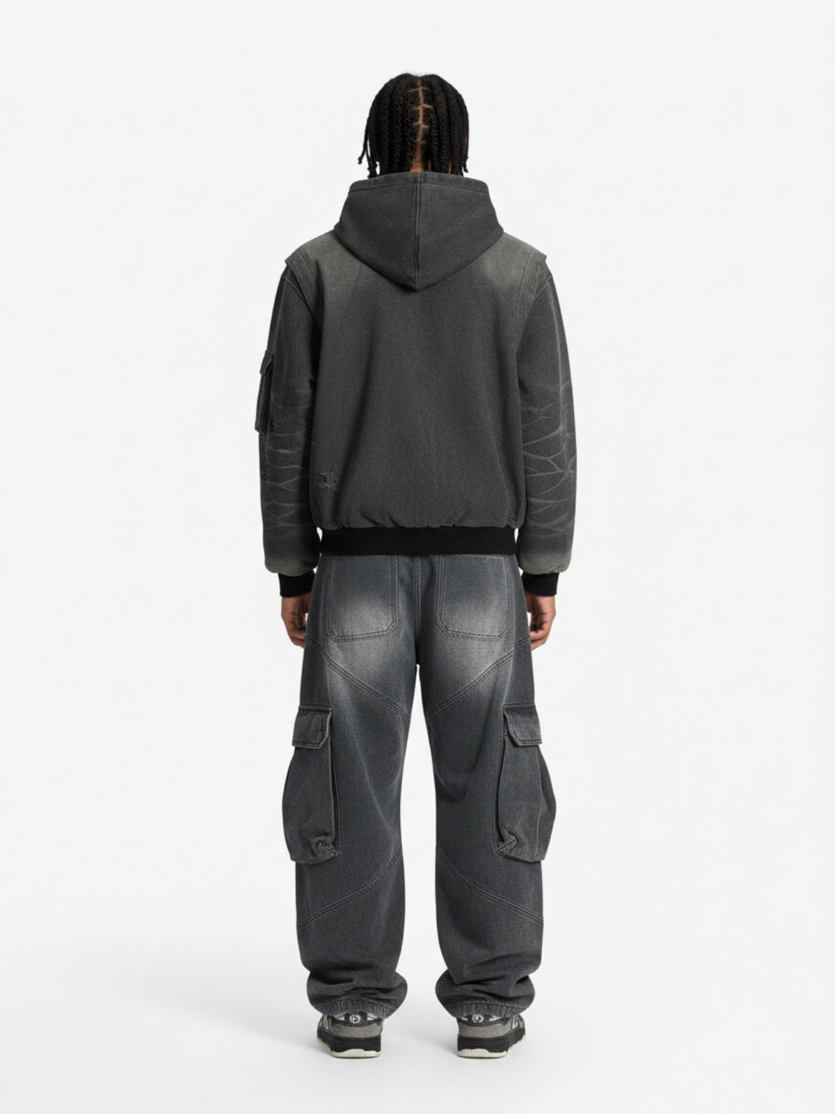 • Design Elements: Distressed patchwork details, large cargo pockets, relaxed fit